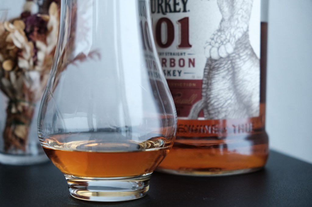 Beim ersten Geruchstest dachte ich zunächst, dass ich mir schon wieder Covid eingefangen habe, denn ich hab so gut wie gar nichts wahrgenommen. Bei 50,5 % Alkohol hab ich zumindest erwartet, dass mir die Nasenhaare abfackeln, aber auch das blieb aus. Nach ein paar Minuten Ruhe im Glas machen sich dann doch ein paar säuerliche Zitrusnoten bemerkbar, die wahrscheinlich vom hohen Roggenanteil in der Maische kommen. Dazu kommt ein nicht näher definierbarer Holzduft und ein Hauch von Obstkorb. All diese Noten sind aber eher zarter Natur, weshalb ich schon beim Riechen den Verdacht bekomme, dass Wild Turkey das Zeug sehr nah an der Mindestreifezeit abfüllt.
