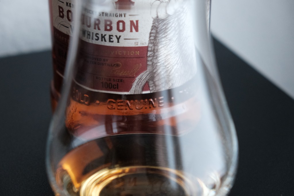 Ein paar Tropfen Wasser geben dem 101 bei der Riechprobe den Bourbon-typischen Eichenholzmuff und bringen die Karamellnote mehr zum Vorschein. Im Mund kommt die Verdünnung ganz gut an, auch hier weicht der Alkohol etwas verbranntem Karamell und Eichenholz, allerdings werden alle anderen Aromen wegverdünnt. Auch vom Abgang bleibt nicht viel übrig.